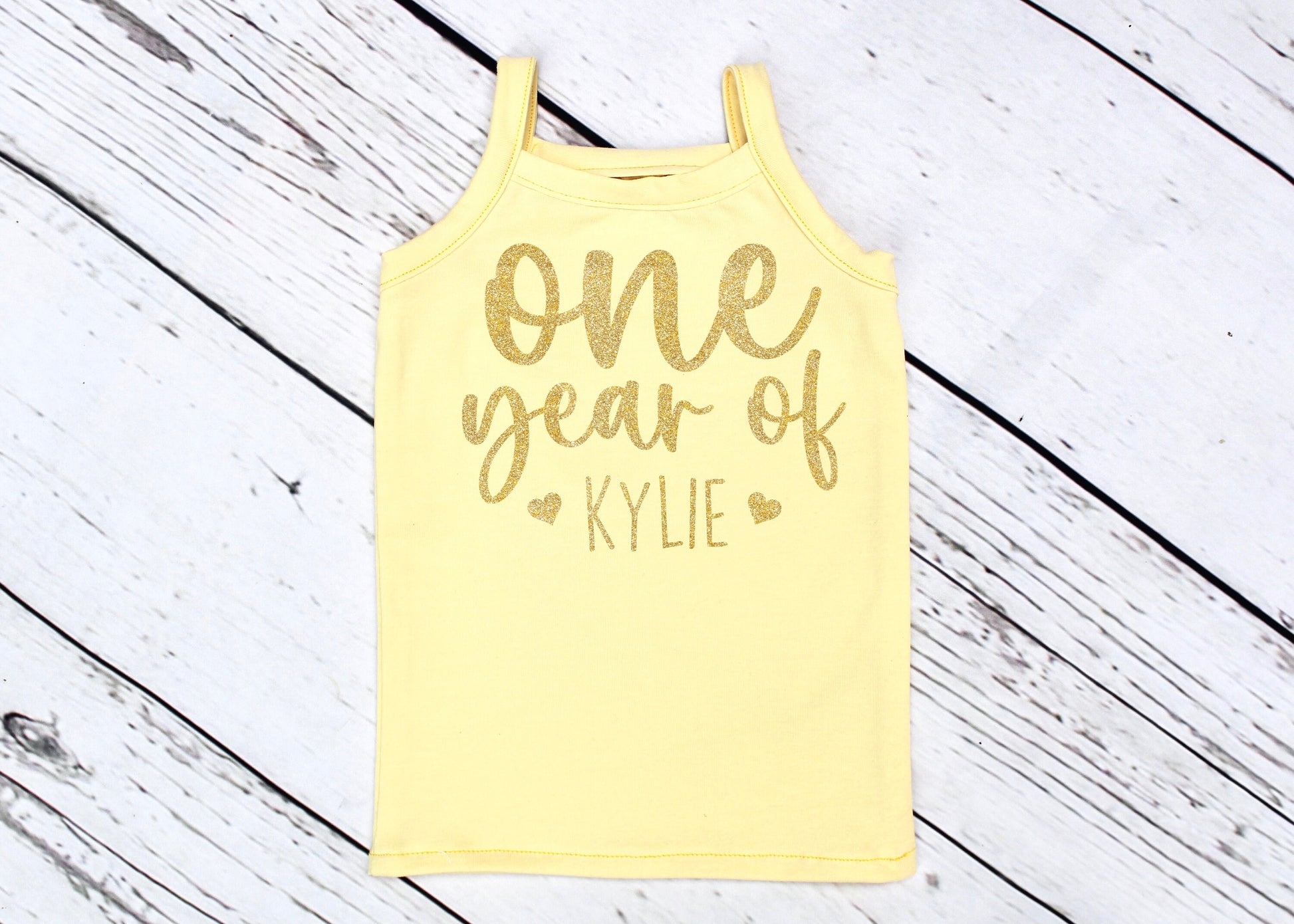 A handmade lemon yellow strappy top with a gold glitter print, reading 'One year of *personalised name*'. Tutu to match in pale pink & yellow pastel shades. Tutus are elasticated, made from 3 layers & feature a ribbon at the waist for extra tightening if needed.