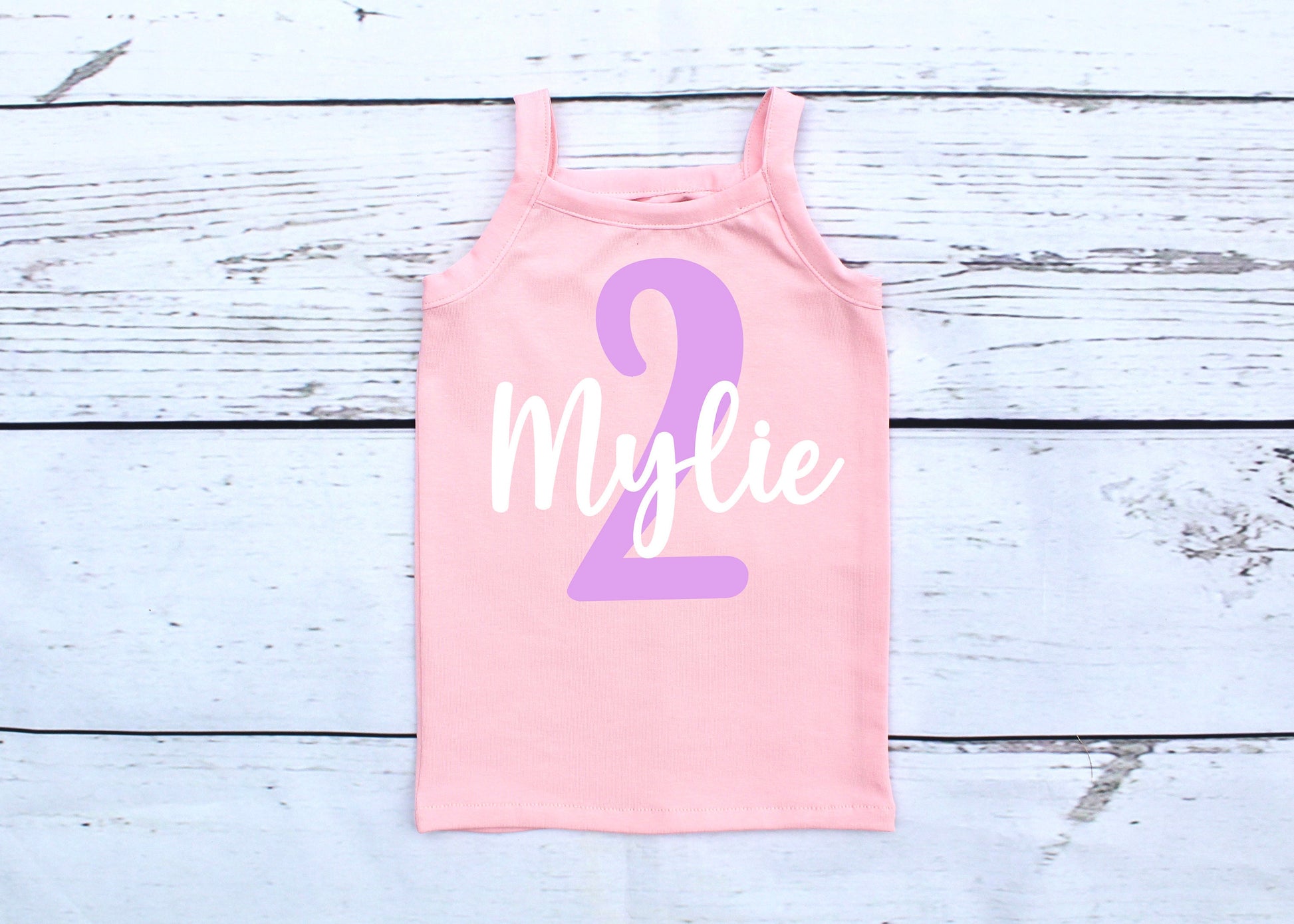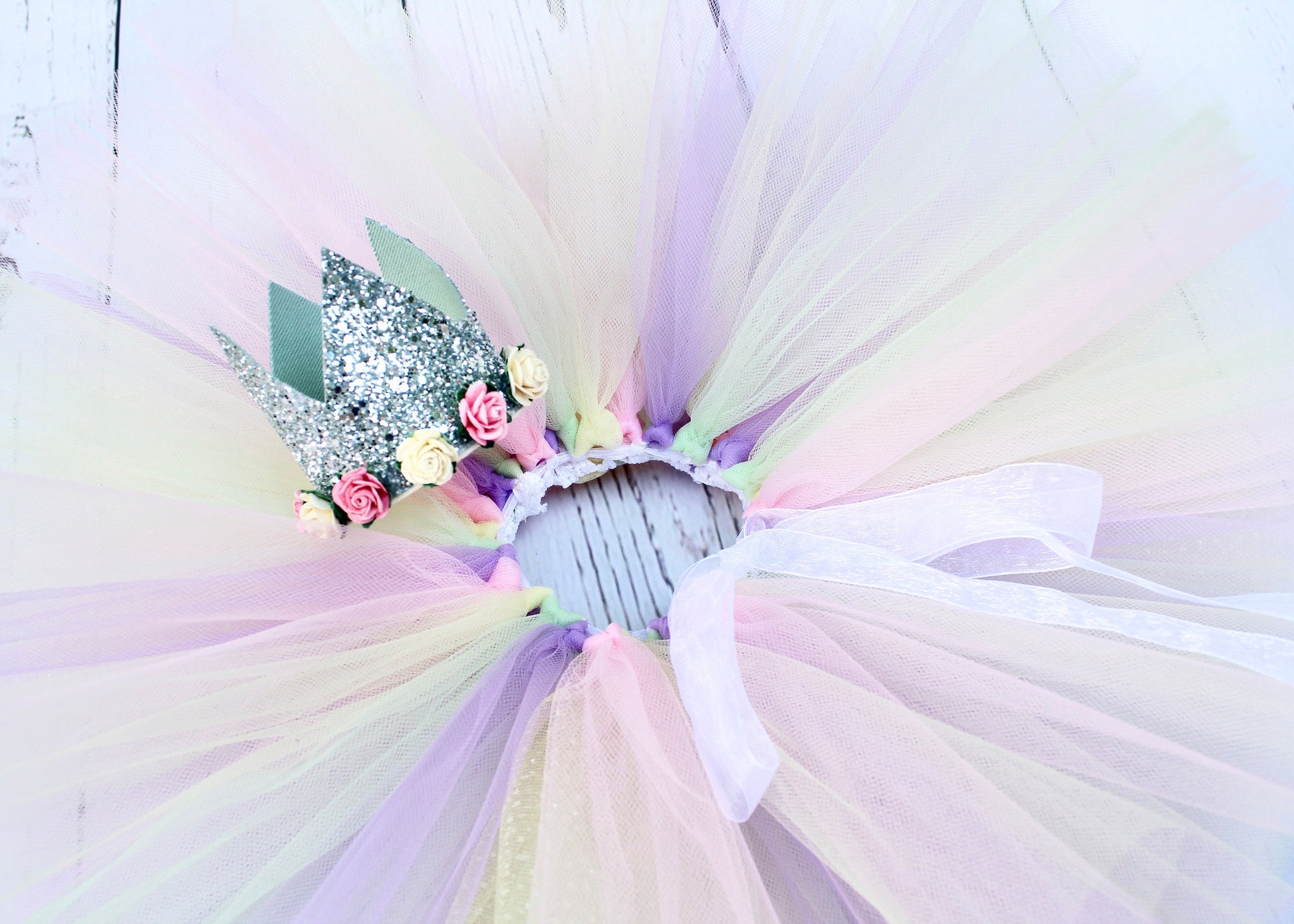A handmade pink strappy top with a lilac & white personalised print. Tutu to match in pastel rainbow shades. Tutus are elasticated, made from 3 layers & feature a ribbon at the waist for extra tightening if needed. Silver glitter crown headband with pretty flowers.