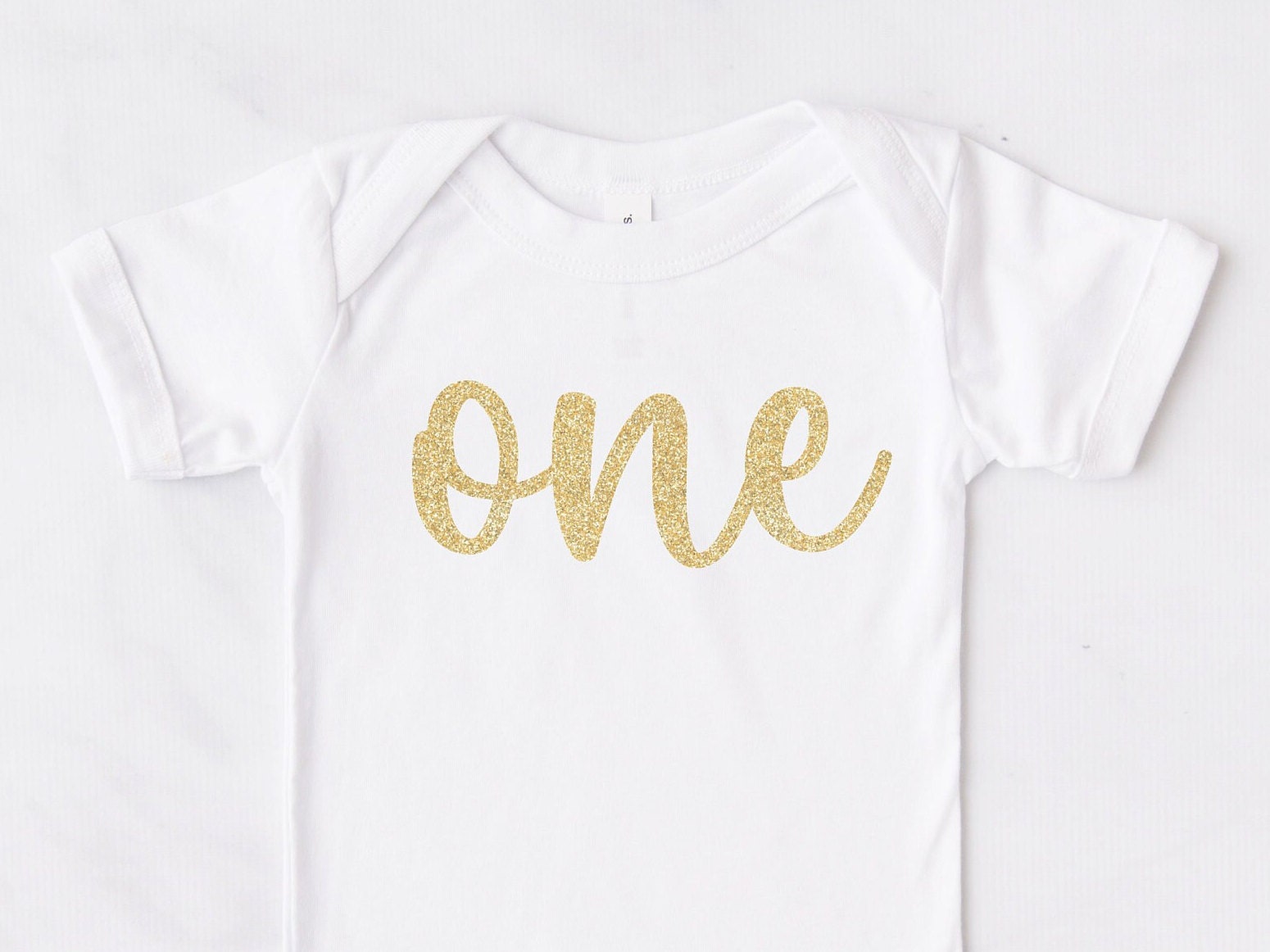 Shine bright on her first birthday in this glamorous gold 'one' bodysuit! The radiant gold finish creates a luxurious, celebratory look perfect for marking this incredible milestone. Ideal for first birthday parties, cake smash photos, or special occasions, this bodysuit makes her feel like royalty on her big day. The soft, comfortable fabric ensures she stays happy and content throughout all the festivities. A dazzling keepsake that captures the sparkle and joy of her first year!