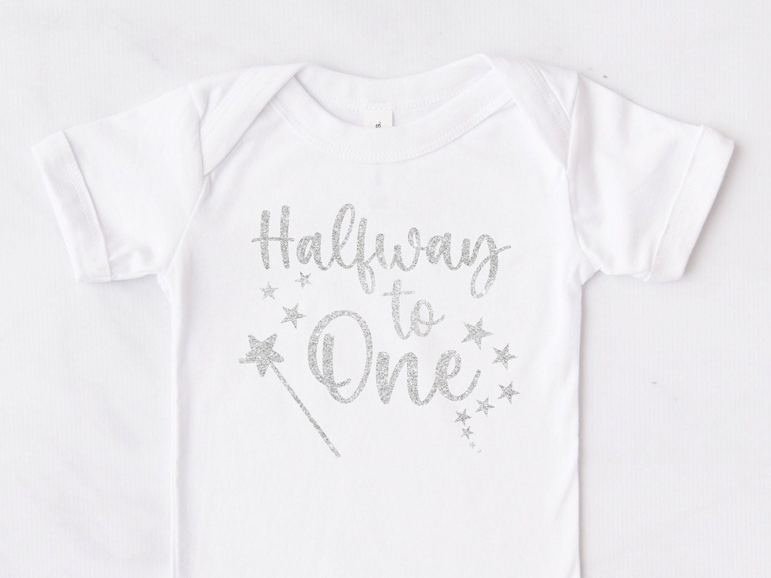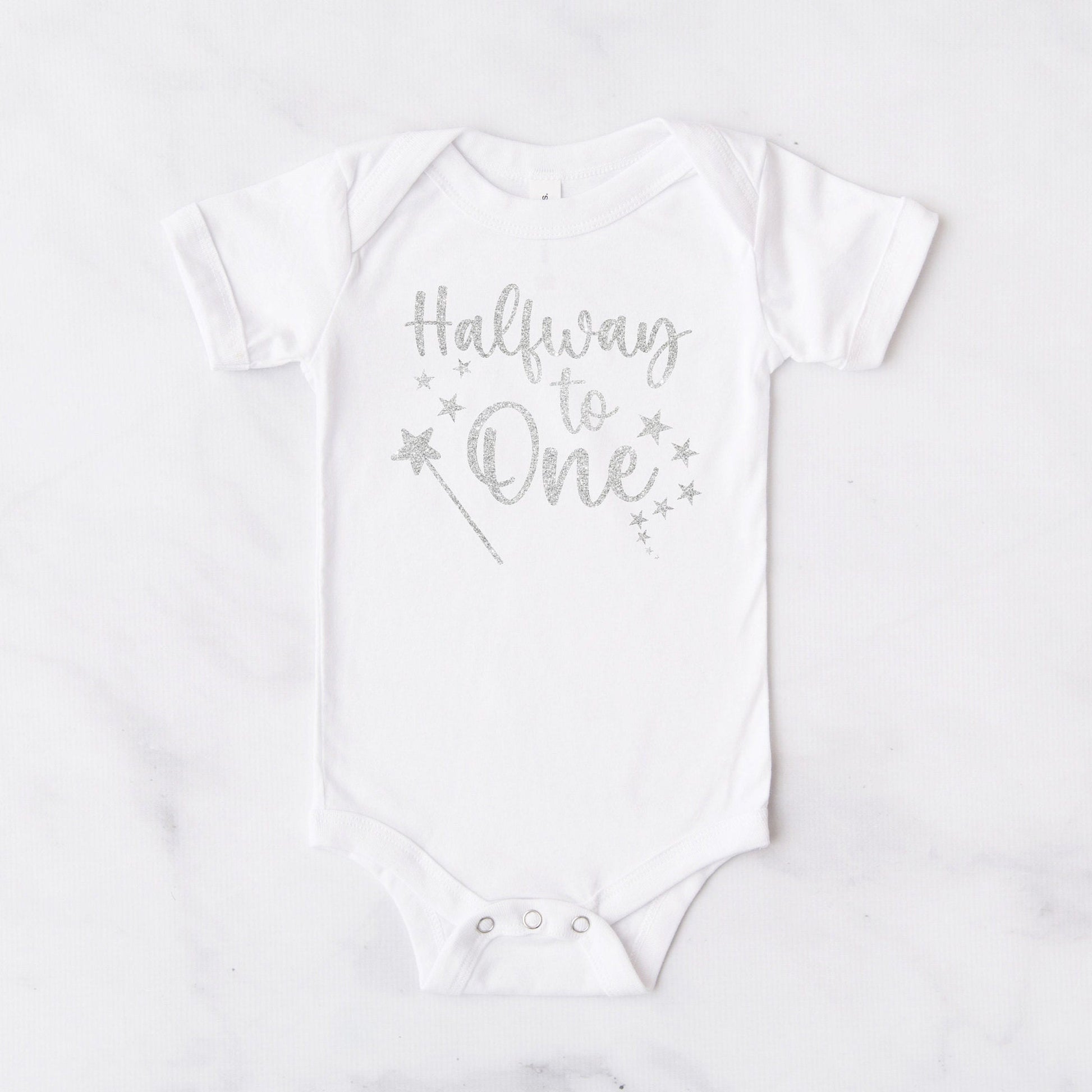 Your little girl will look adorable in our sparkly fairy wand half birthday bodysuit. The super soft cotton vest has a beautiful, sparkly silver glitter design, featuring 'Halfway To One' printed in a pretty, curly font, surrounded by little stars & a fairy wand. Perfect for a half birthday photo shoot & comfy enough to wear all day long.