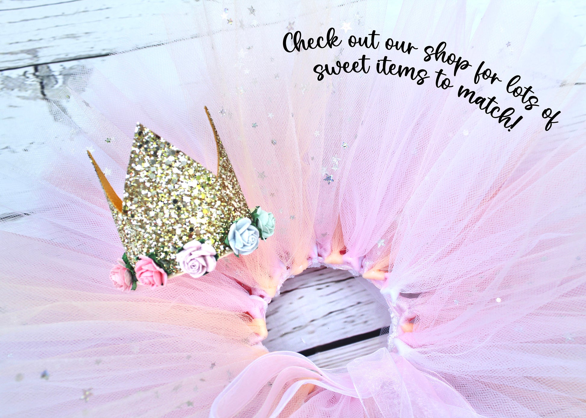 Sparkly chunky gold glitter crown, made from soft glitter fabric. The crown is a stunning champagne, paler gold shade & features a felt base for a softer feel when worn. The flowers are in a range of pastel rainbow colours - peach, pink, lilac, aqua, etc.