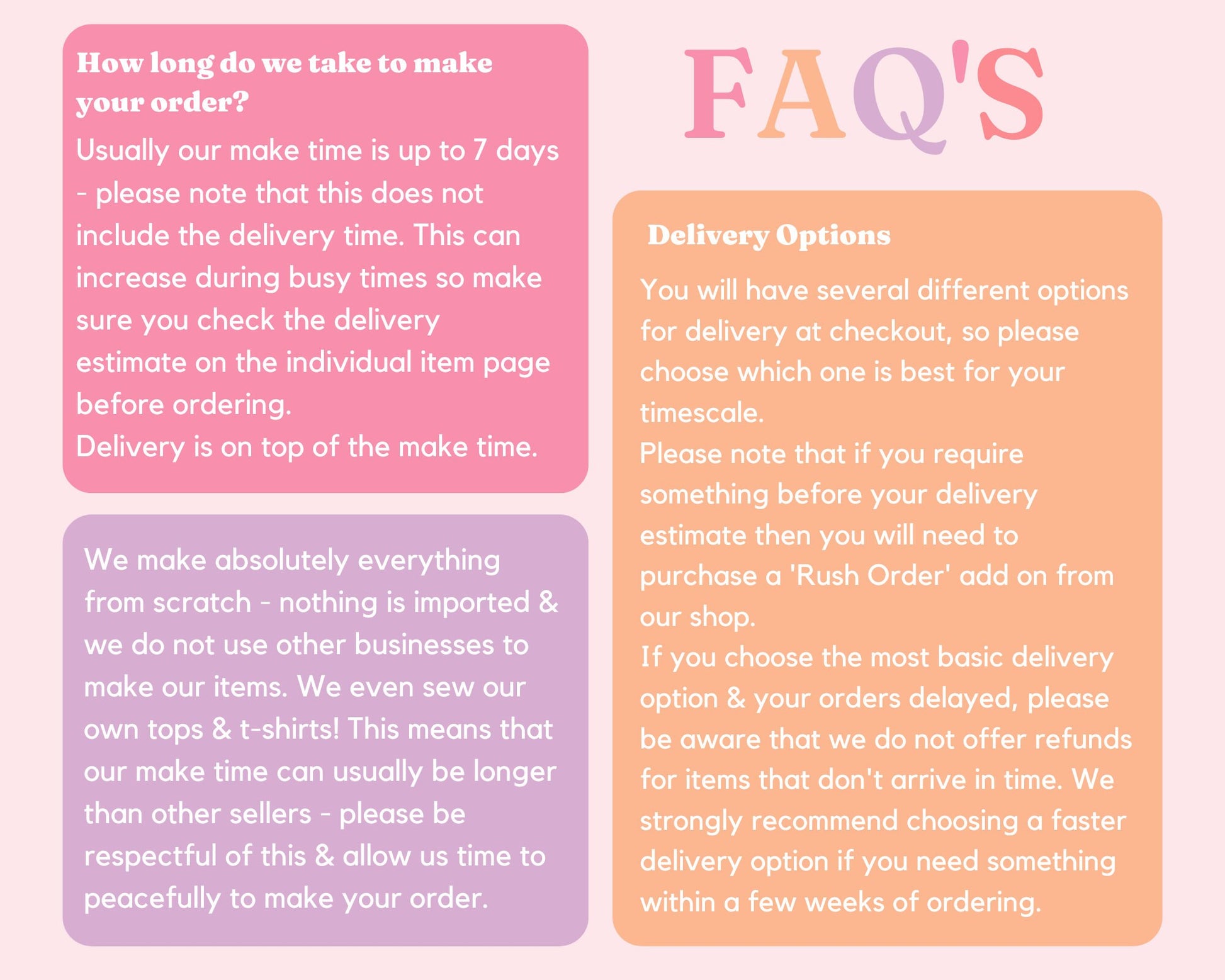 So when ordering, please just remember you will have a 'make time period' to wait before your order is shipped, then delivery is on top of this. We try to make things quickly but please be prepared to wait up to 5 business days for us to make your item as a precaution, as we are super busy during certain times.