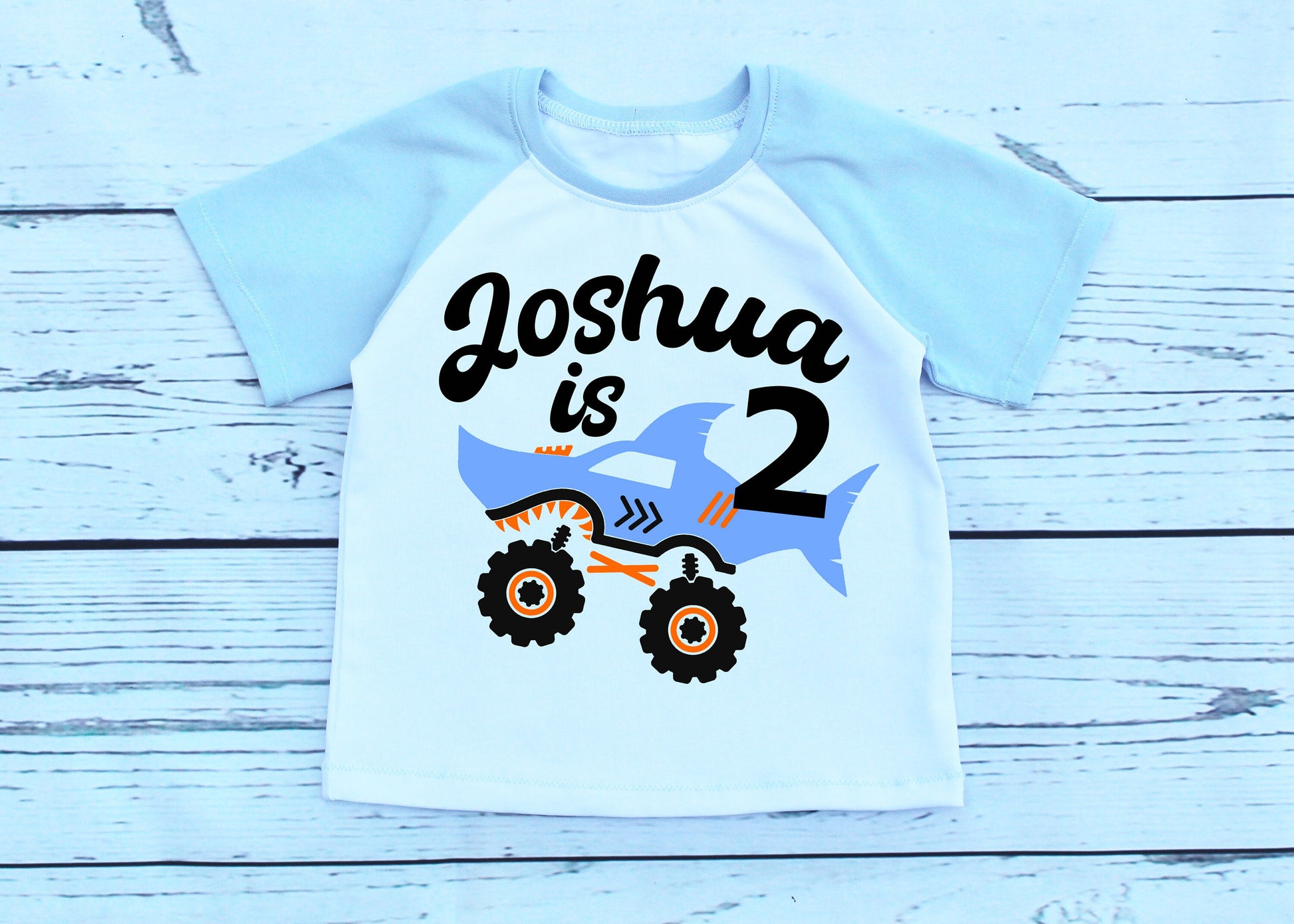 Blue handmade raglan shirt - features a shark monster truck print, personalised with your little ones name!