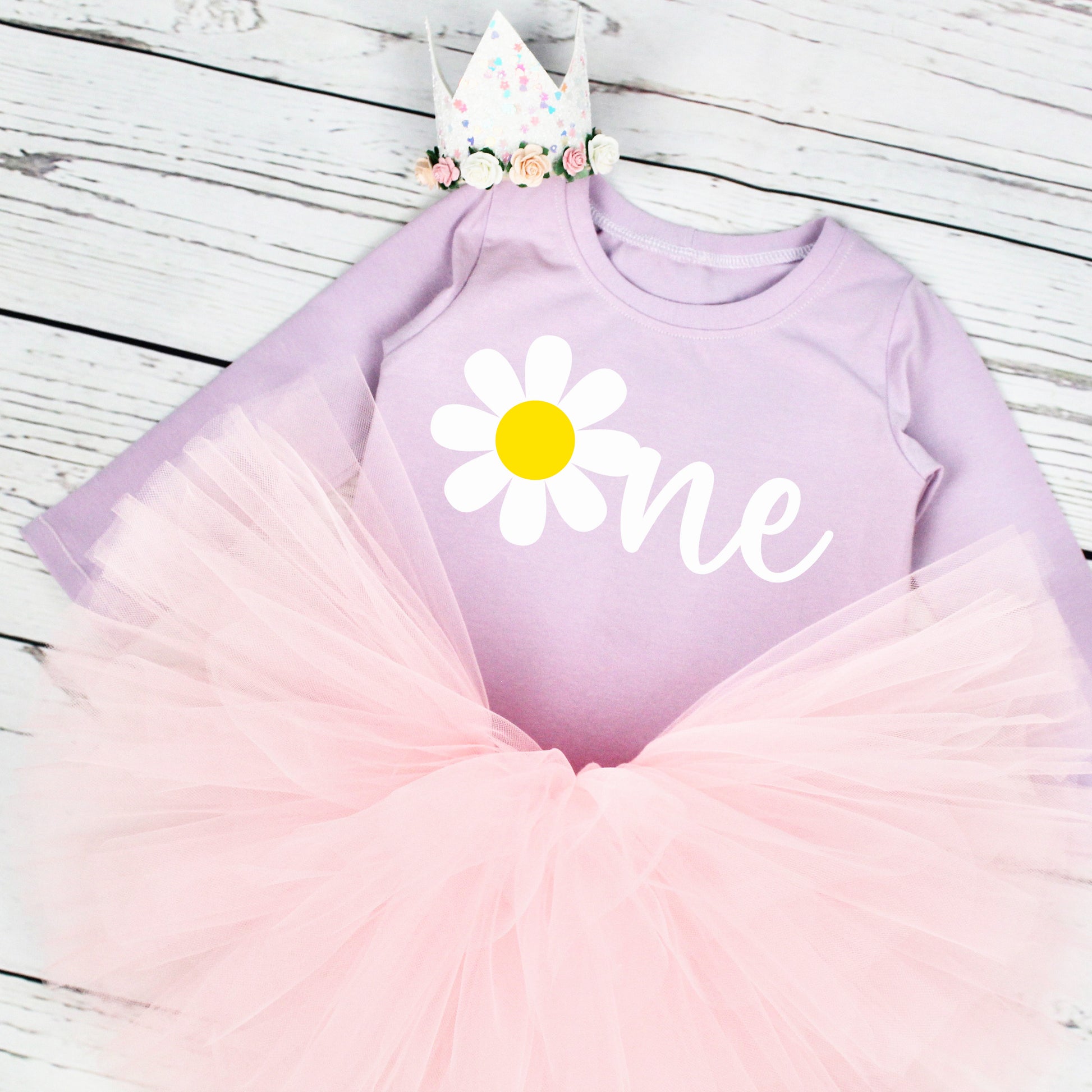 You will receive a pink tutu skirt, made from 3 layers of soft nylon tulle, as well as a lilac top with a daisy 'one' print. You can also choose to have the crown as part of the outfit.