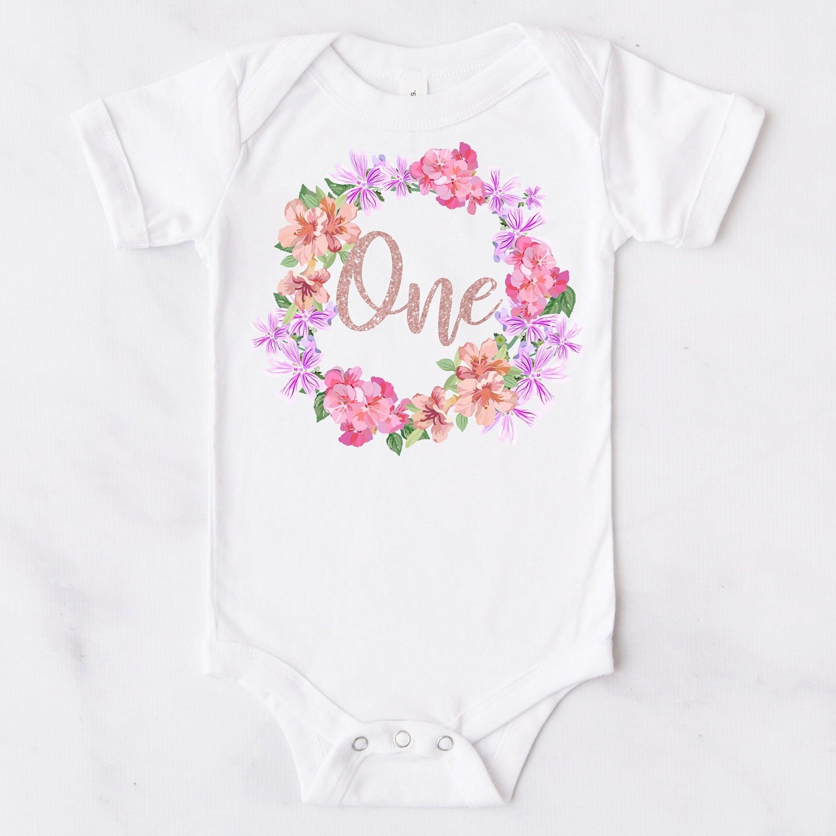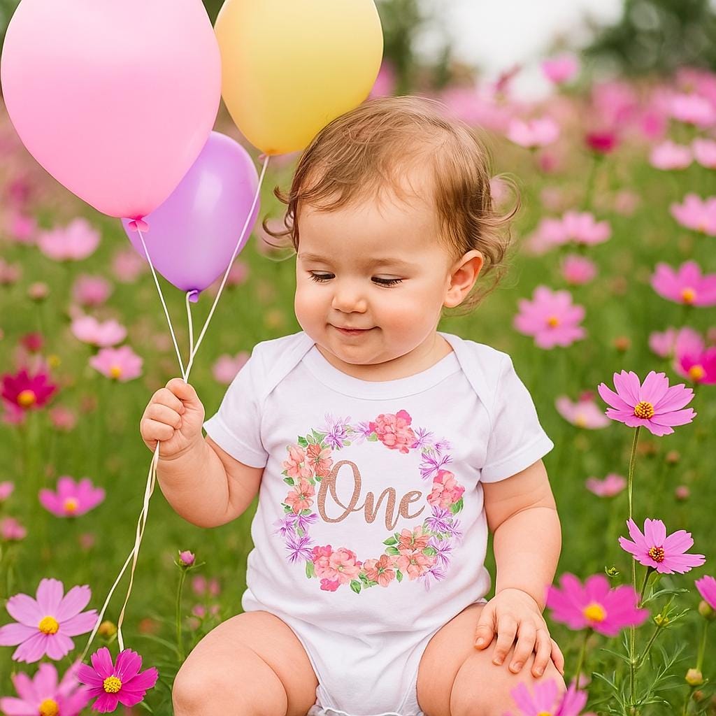 Sparkle into her first year with this gorgeous rose gold floral wreath 'one' bodysuit! The elegant rose gold finish combined with delicate floral details creates a sophisticated yet playful look perfect for celebrating this milestone. Ideal for first birthday photos, cake smash sessions, or special family gatherings, this bodysuit adds glamour to her big day. The soft, comfortable fabric keeps her happy and content while looking absolutely stunning. A beautiful keepsake that captures the magic of turning one in style and elegance!