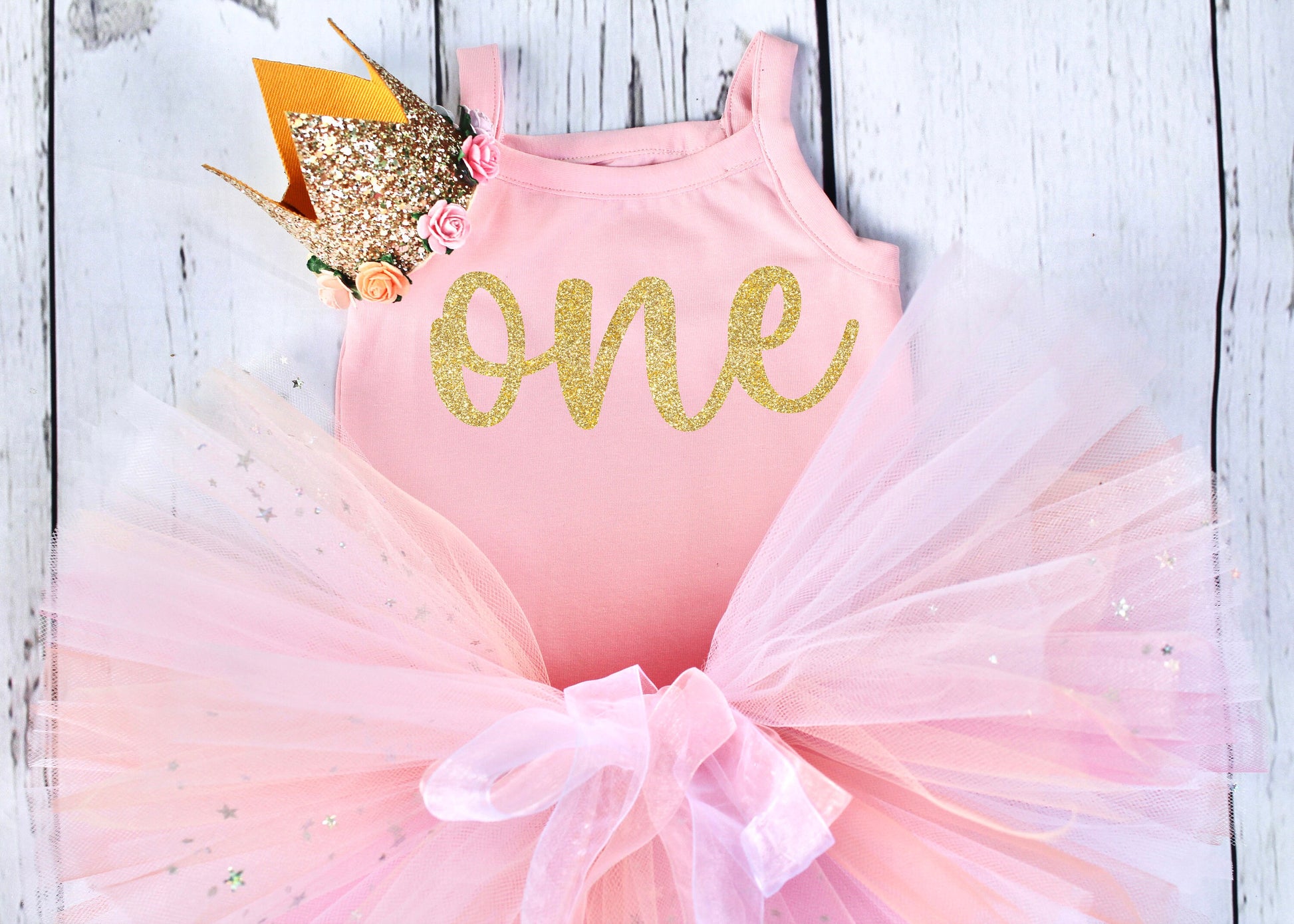 Gold & pink tutu outfit for girls birthday. Features a handmade pink strappy tank top with gold glitter age print. Tutu is made over 3 layers from fluffy pink, peach & white tulle. You can choose to also have a crown if you'd like that to finish off your outfit!