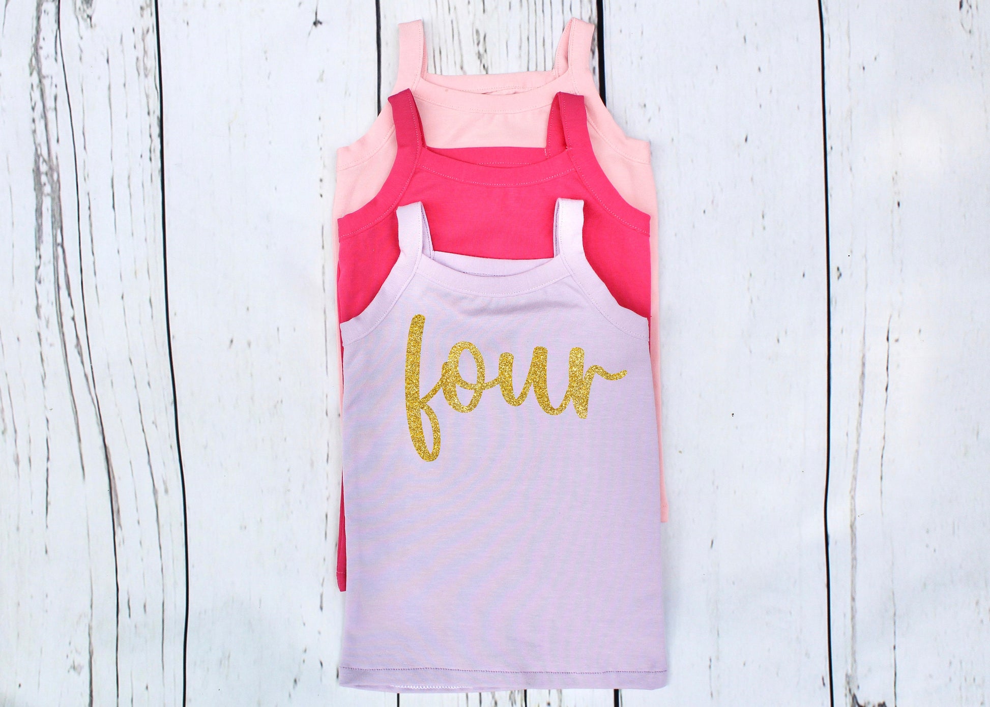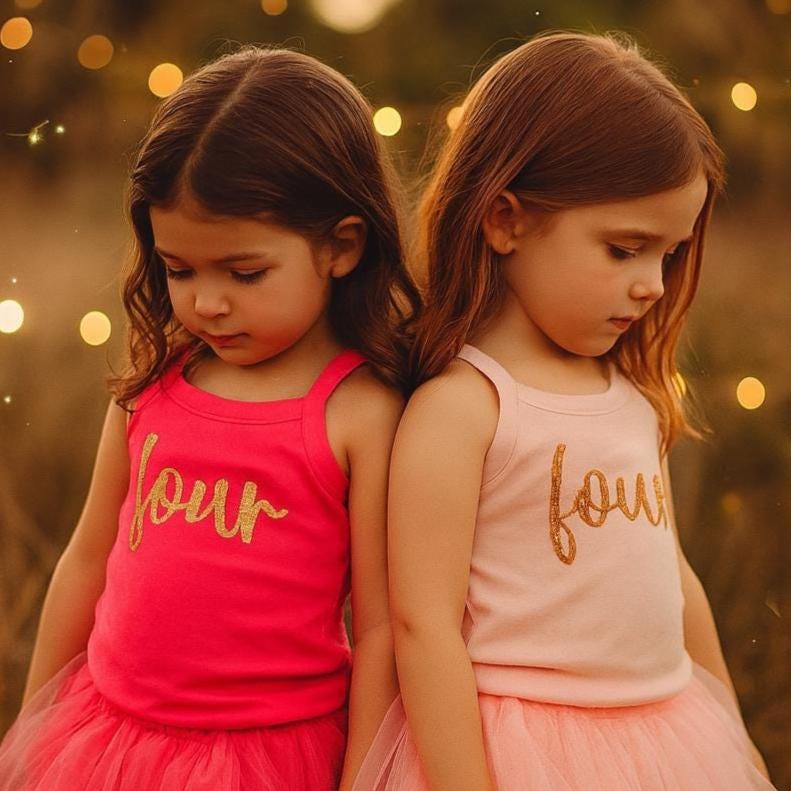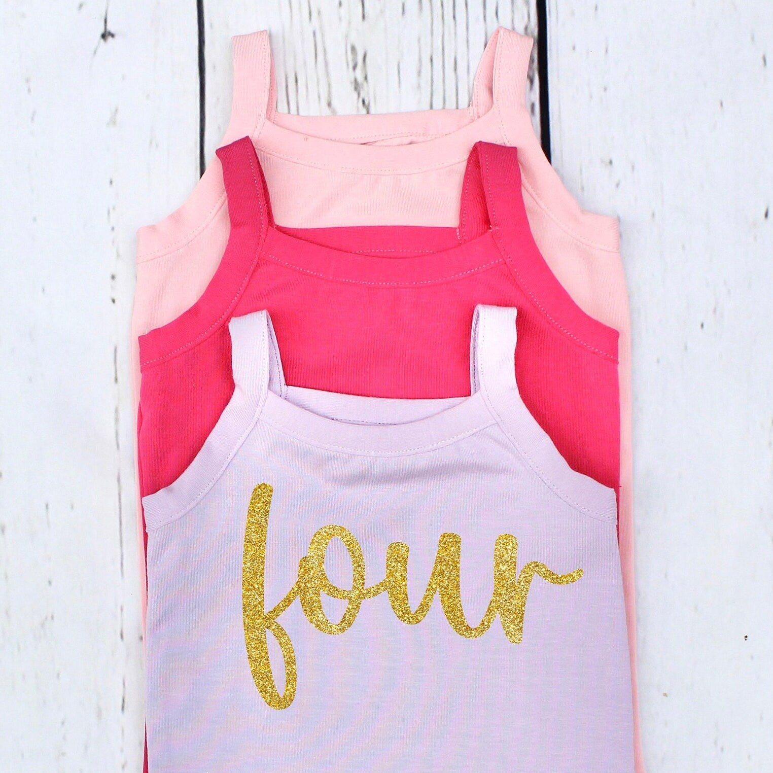 Coloured spaghetti strap tank top, girls 4th birthday t-shirt - features a 'four' print in gold glitter.