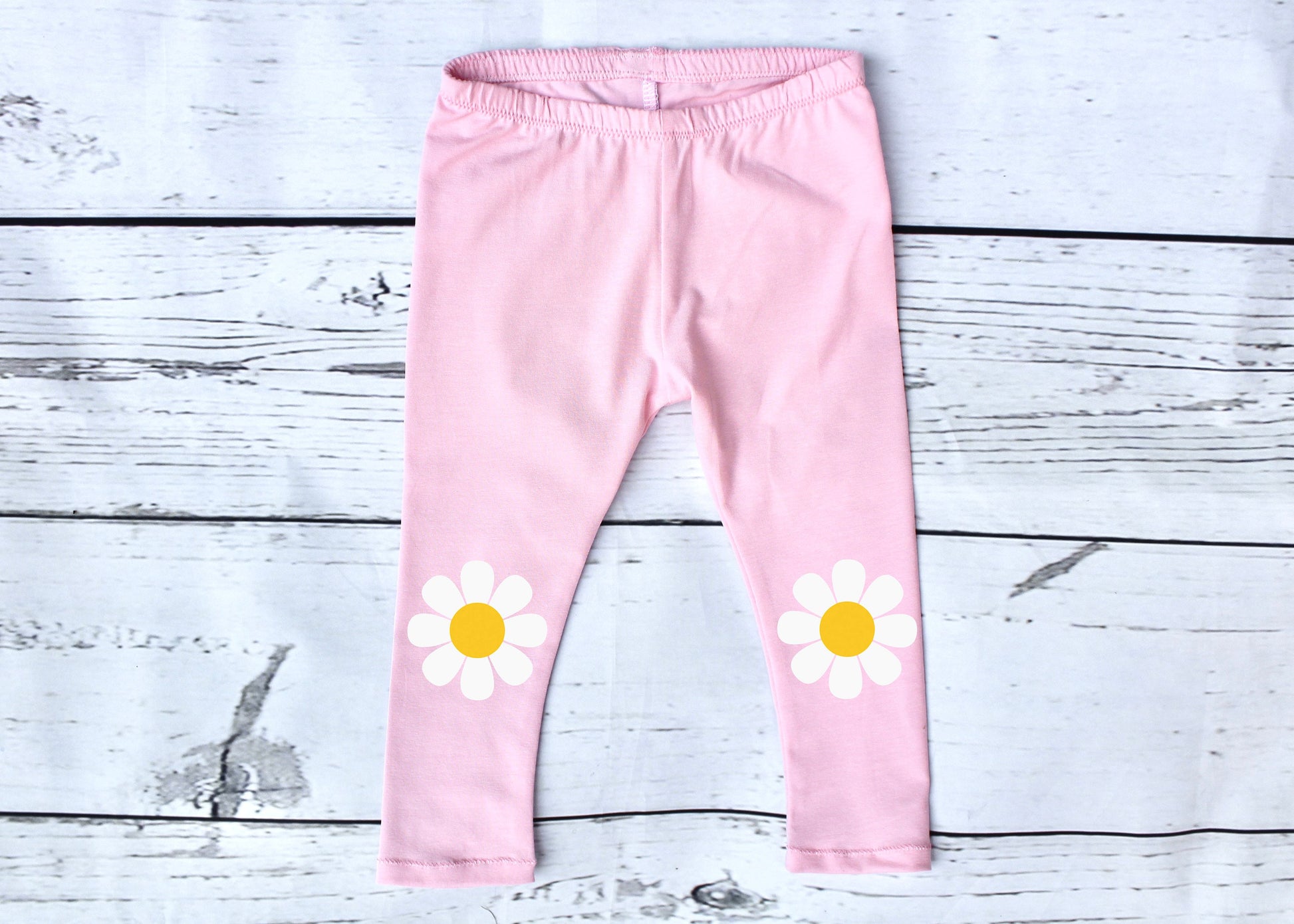 Groovy girls leggings with daisies printed on the knees - choose from peach, pink or lilac.