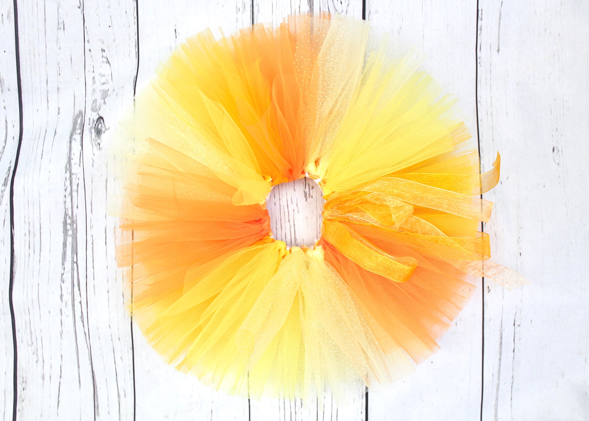 We have made this using 3 layers of fluffy tulle, in oranges & yellows, then finished off with sparkles. The crown is made using the sparkliest yellow glitter fabric & lovely little flowers.