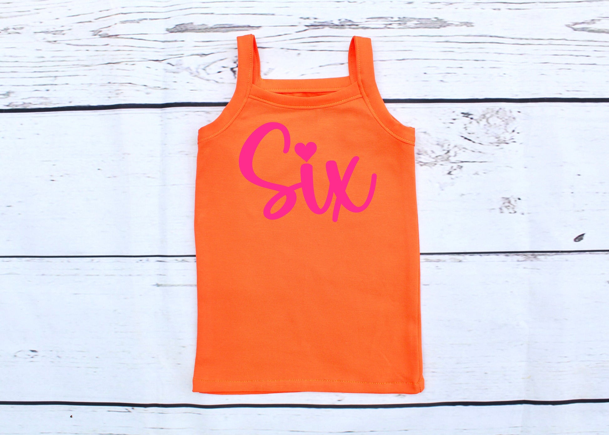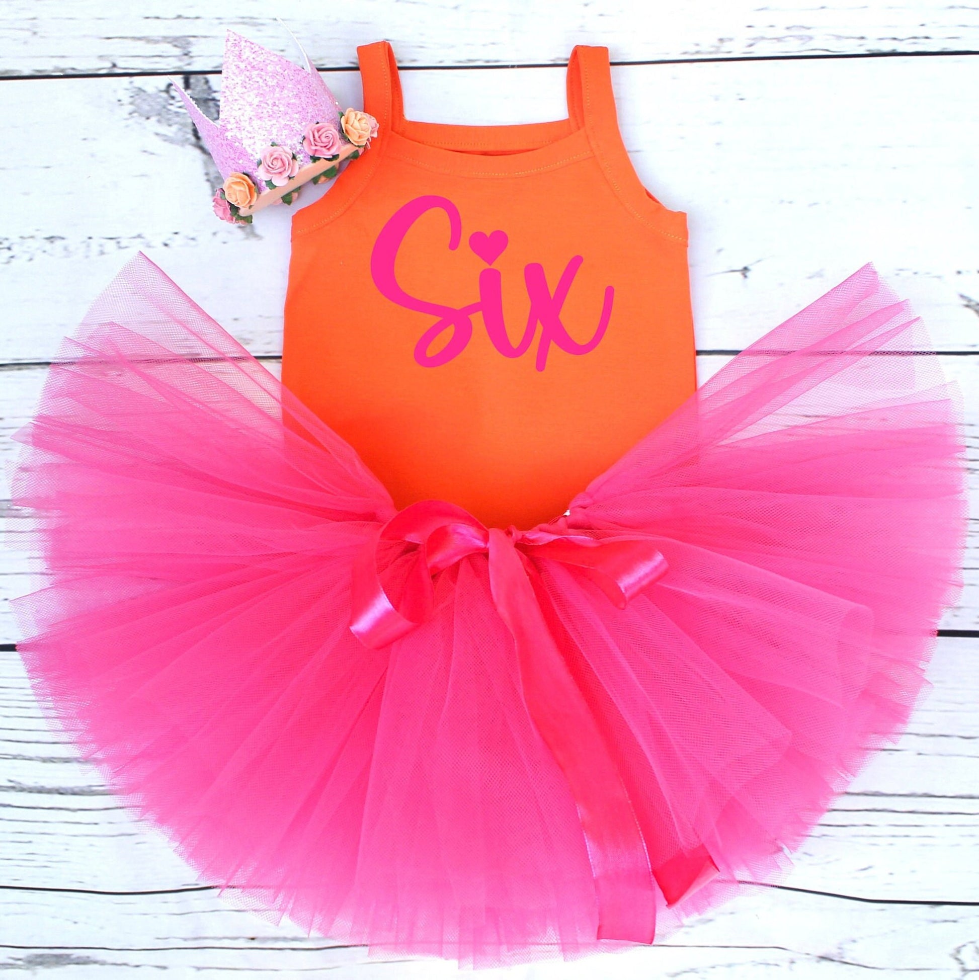 Orange & pink tutu outfit for girls birthday. Features a handmade orange strappy tank top with 'six' print in pink. Tutu is made over 3 layers from fluffy pink tulle. You can choose to also have a crown if you'd like that to finish off your outfit!