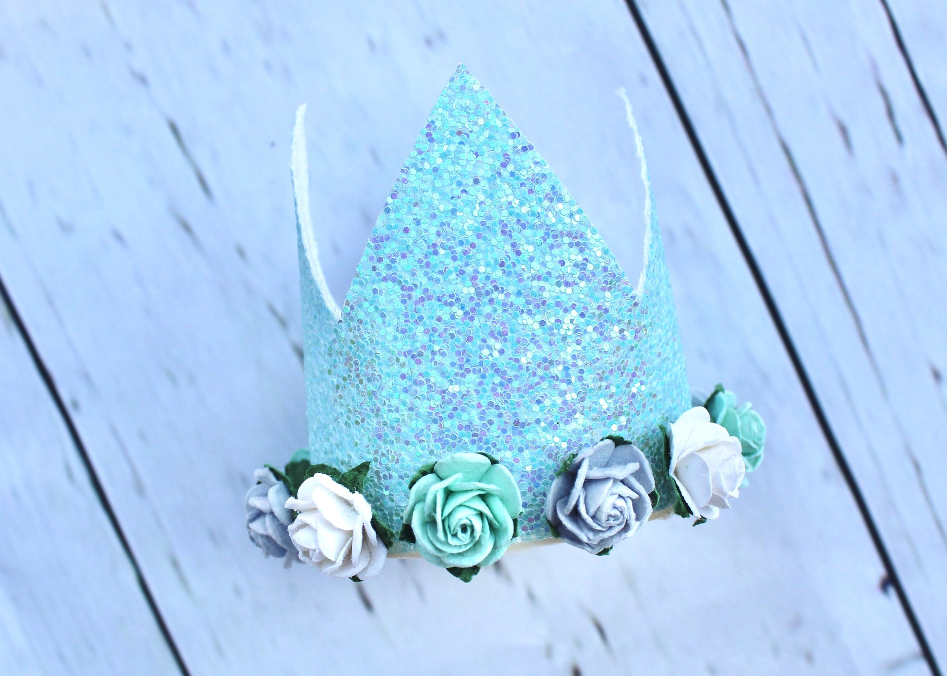 Sparkly aqua blue glitter crown, made from soft glitter fabric. The crown features a felt base for a softer feel when worn. The flowers are in blue, aqua and white shades.