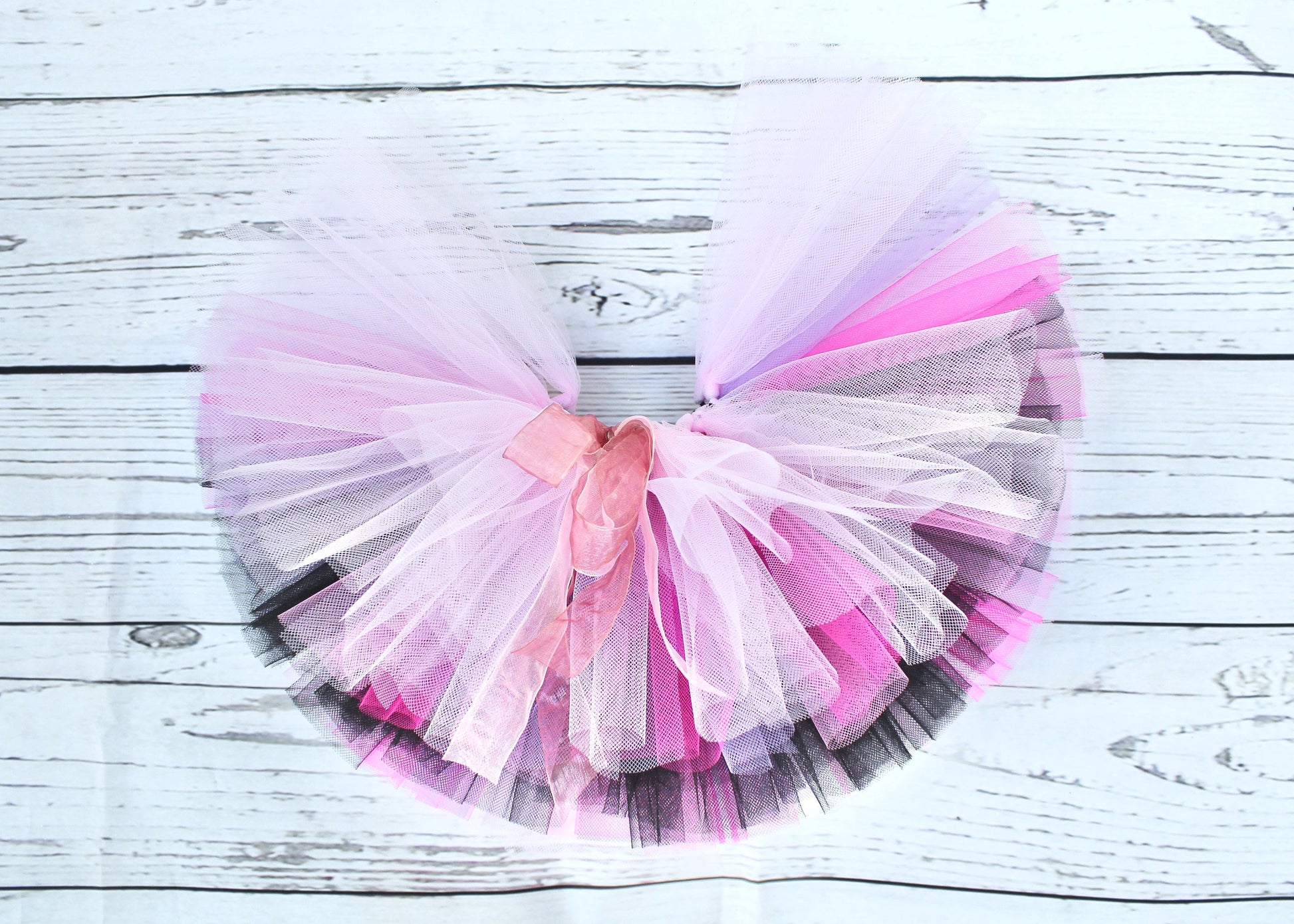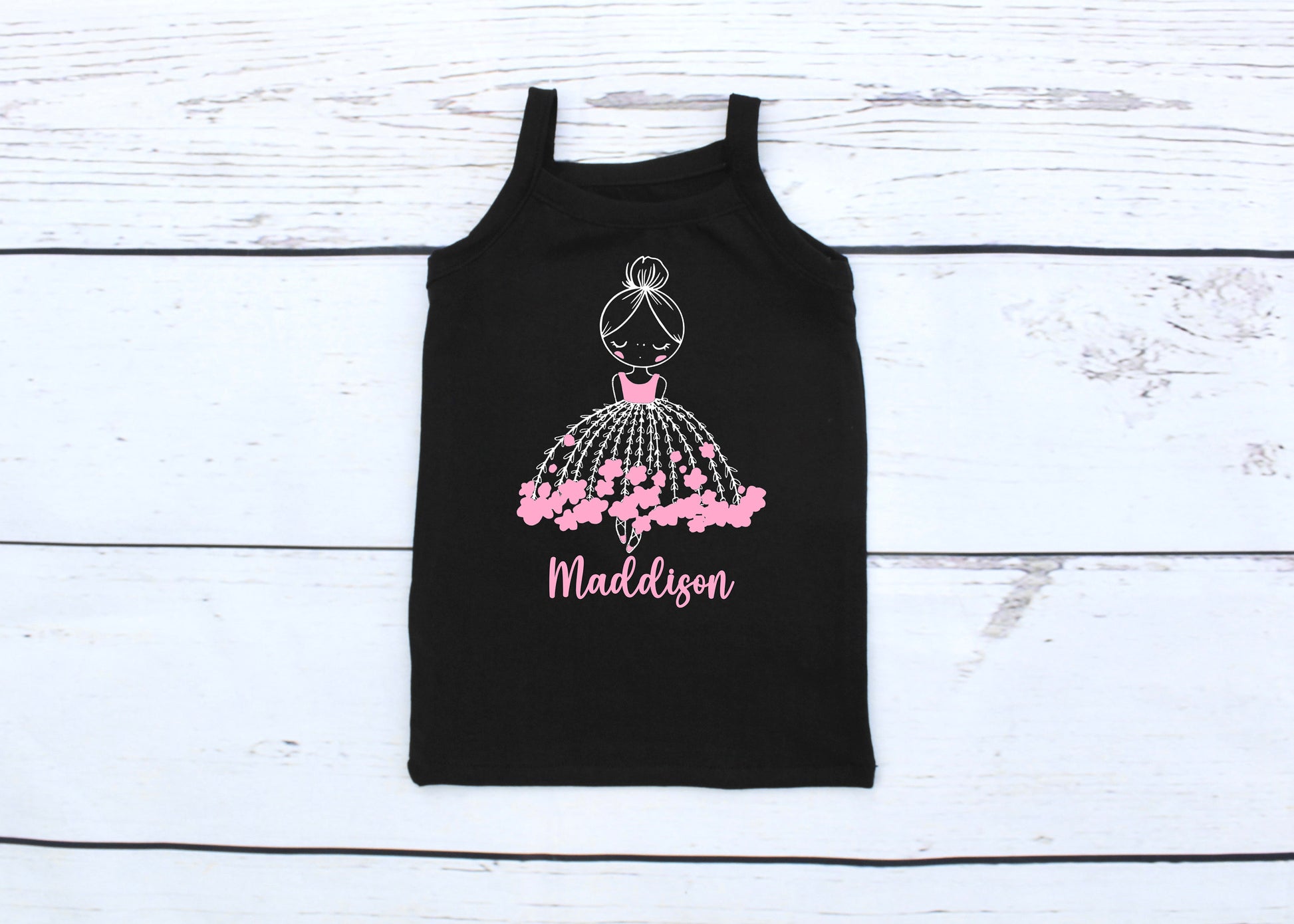 Personalised black & pink tutu outfit for girls birthday. Features a handmade black strappy tank top with a sweet ballerina and your little ones name print in pink and white. Tutu is made over 3 layers from fluffy pink, lilac & black tulle.