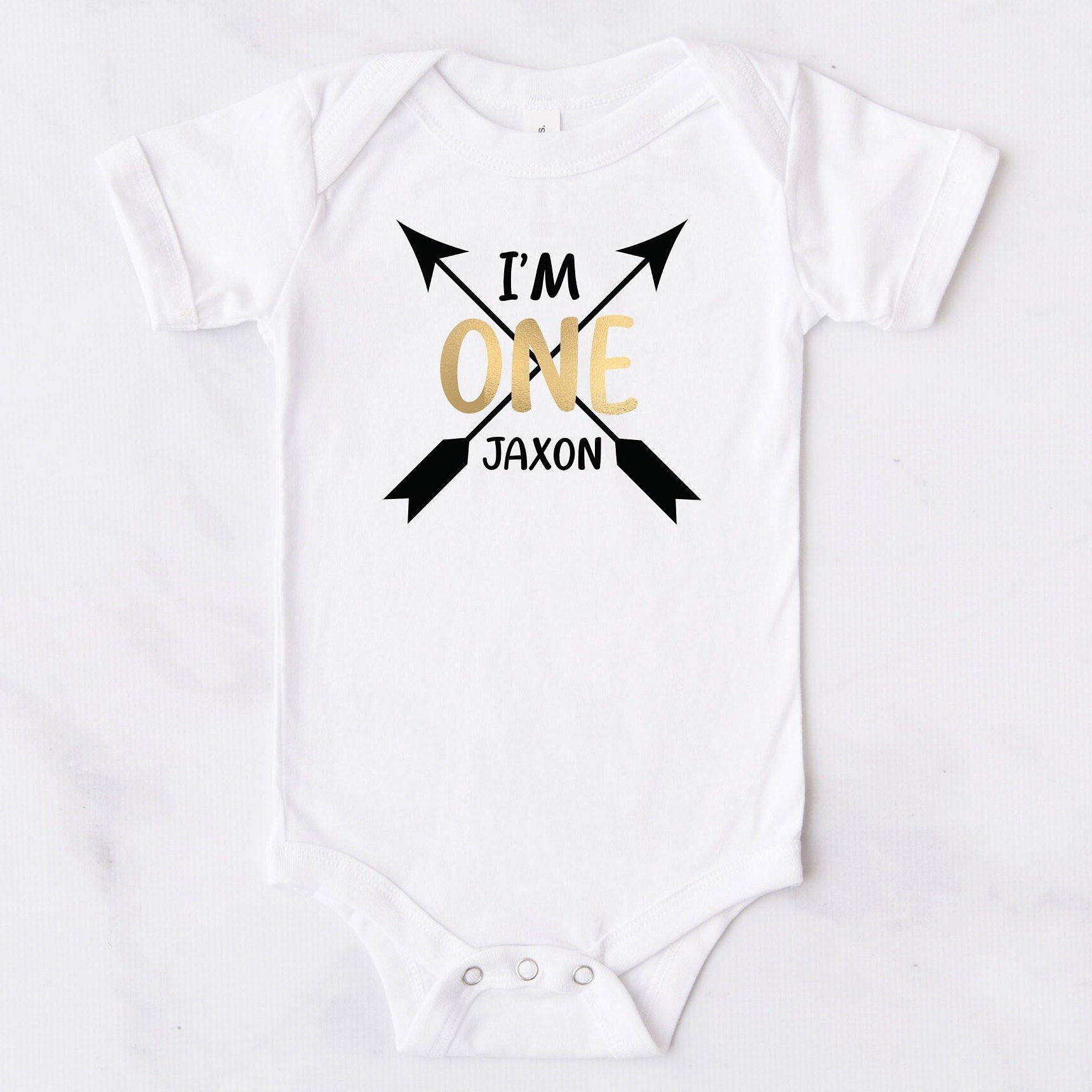 Celebrate his milestone in style with a personalised “I’m One” birthday bodysuit! This custom baby boy’s first birthday vest features a modern tribal arrow design and bold “I’m One” print—perfect for cake smash photos, birthday parties, or as a keepsake for his memory box. Personalise with your little one’s name for a truly one-of-a-kind outfit.