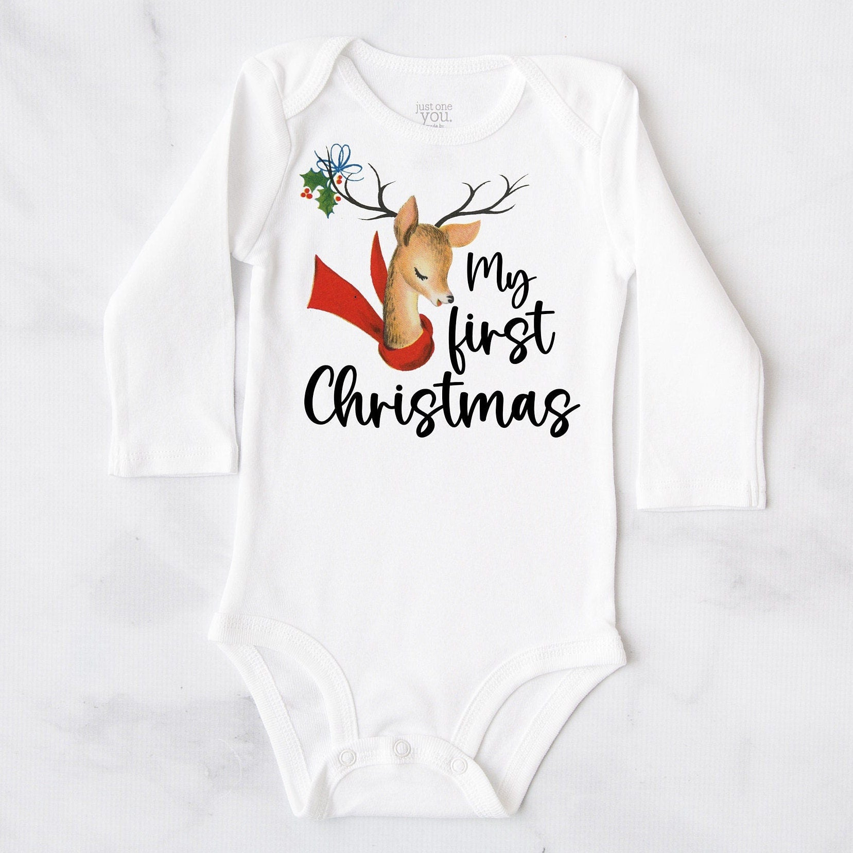 This listing is for a super adorable baby bodysuit. It's white and features a vintage reindeer print, saying 'My first Christmas'.