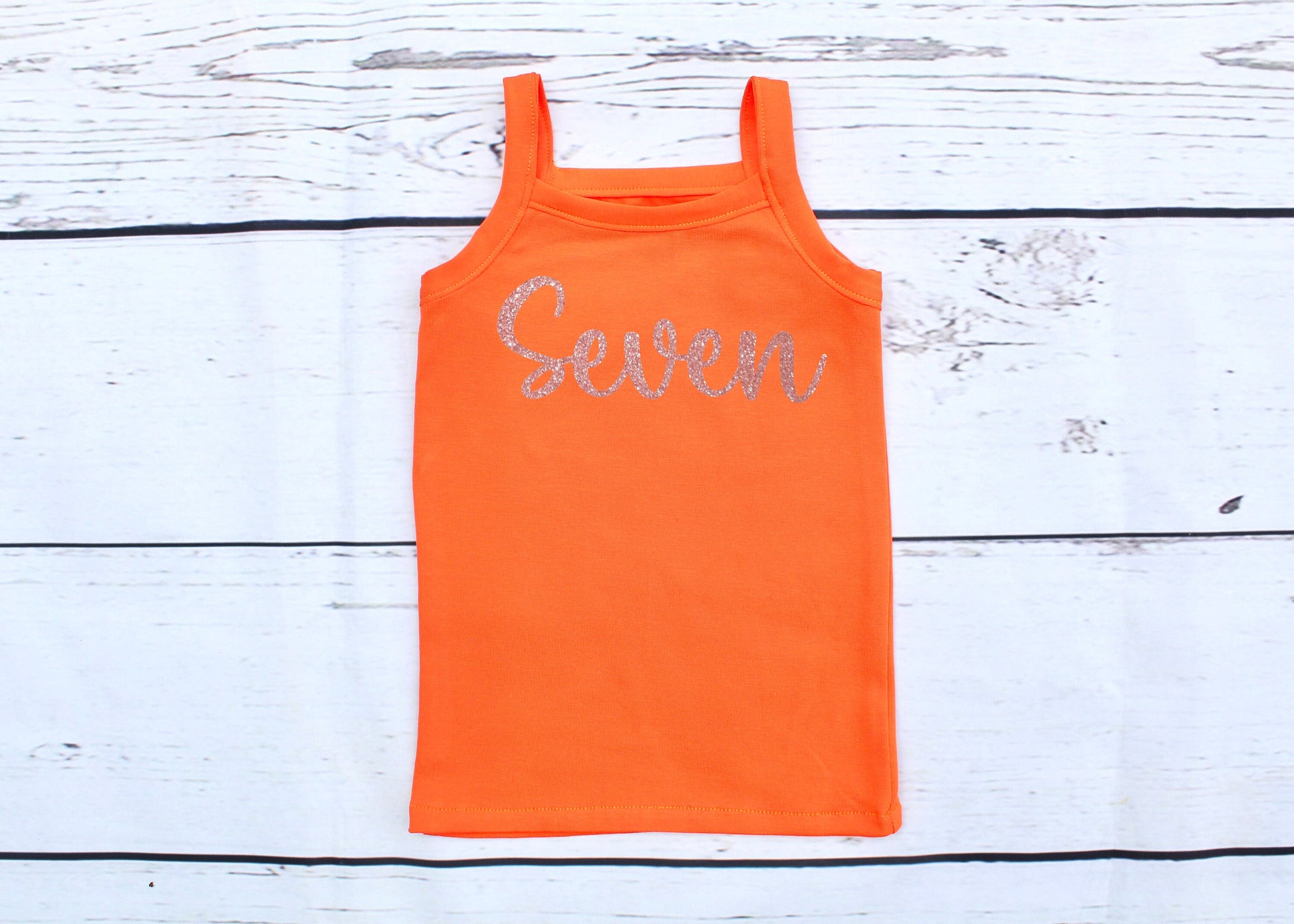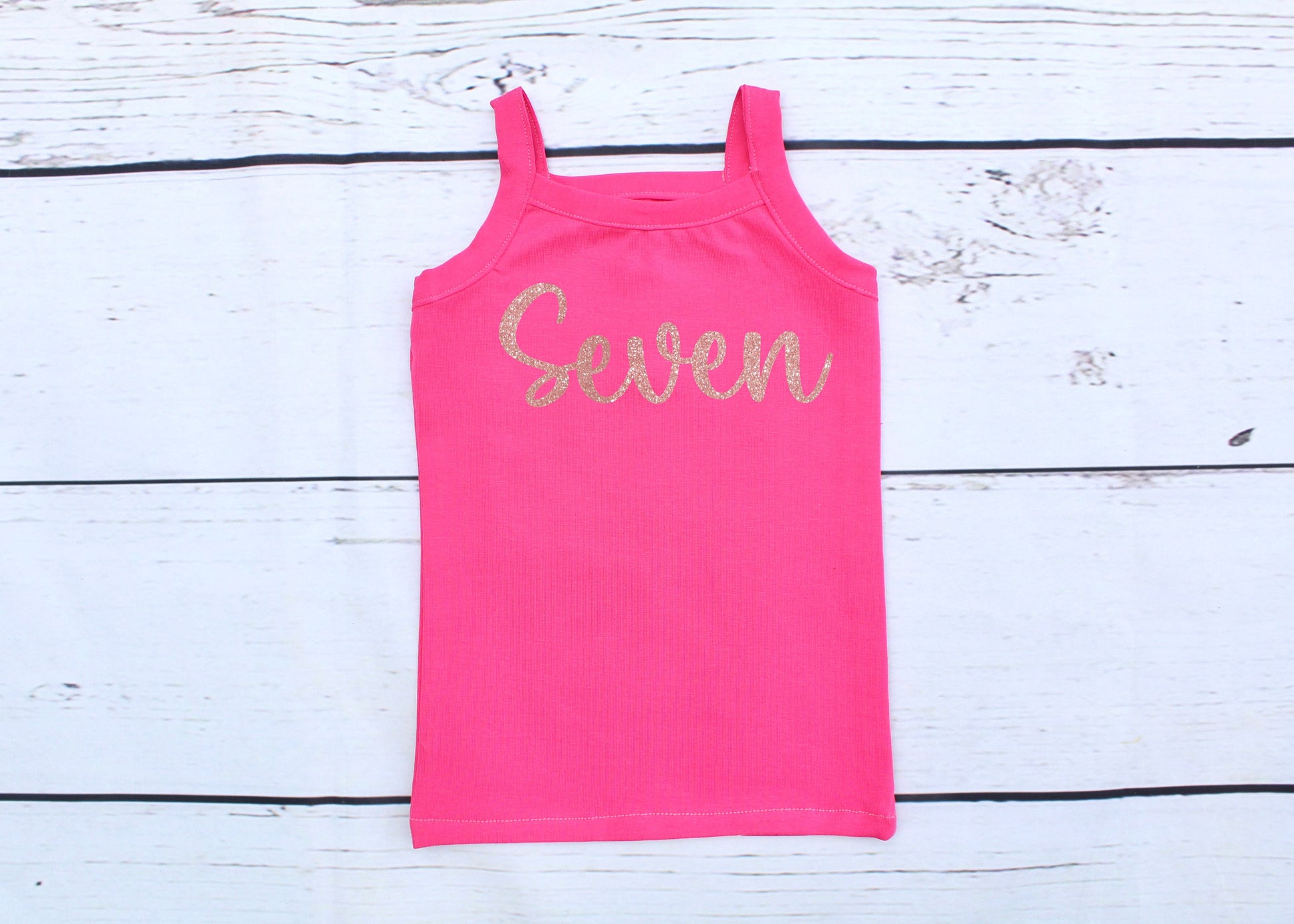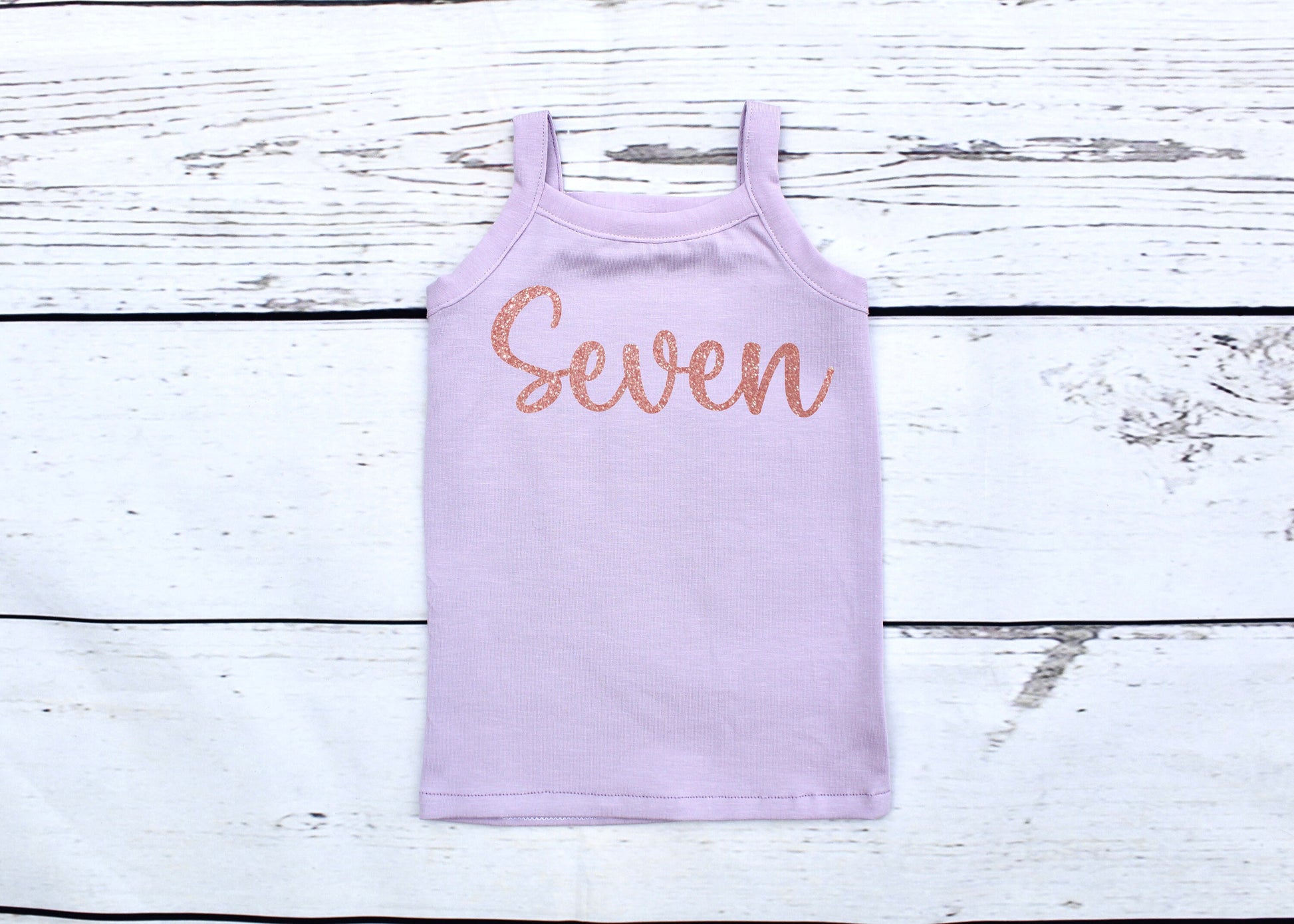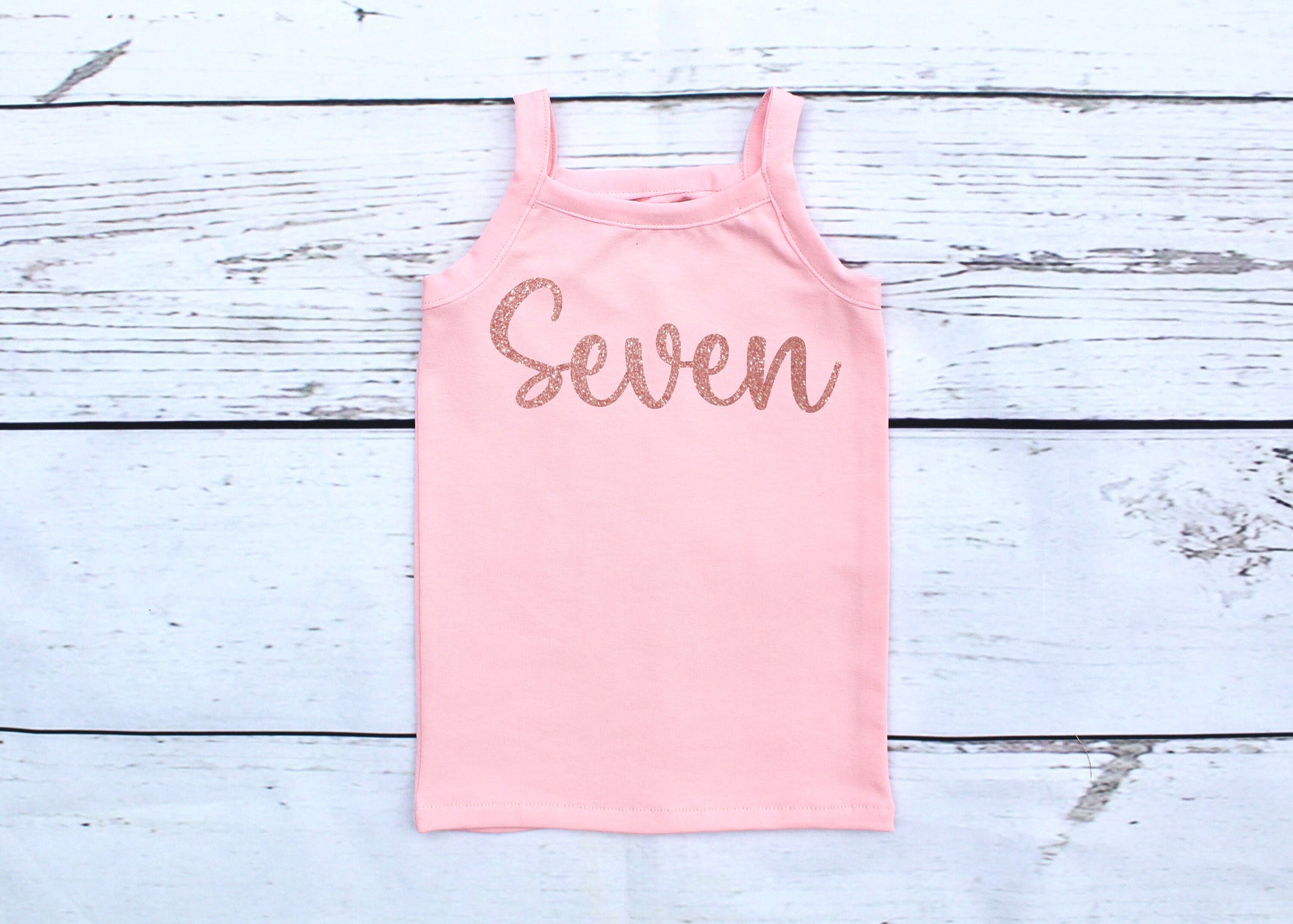 Personalised colour strappy top for girls 7th birthday. Print is rose gold and reads 'Seven'.