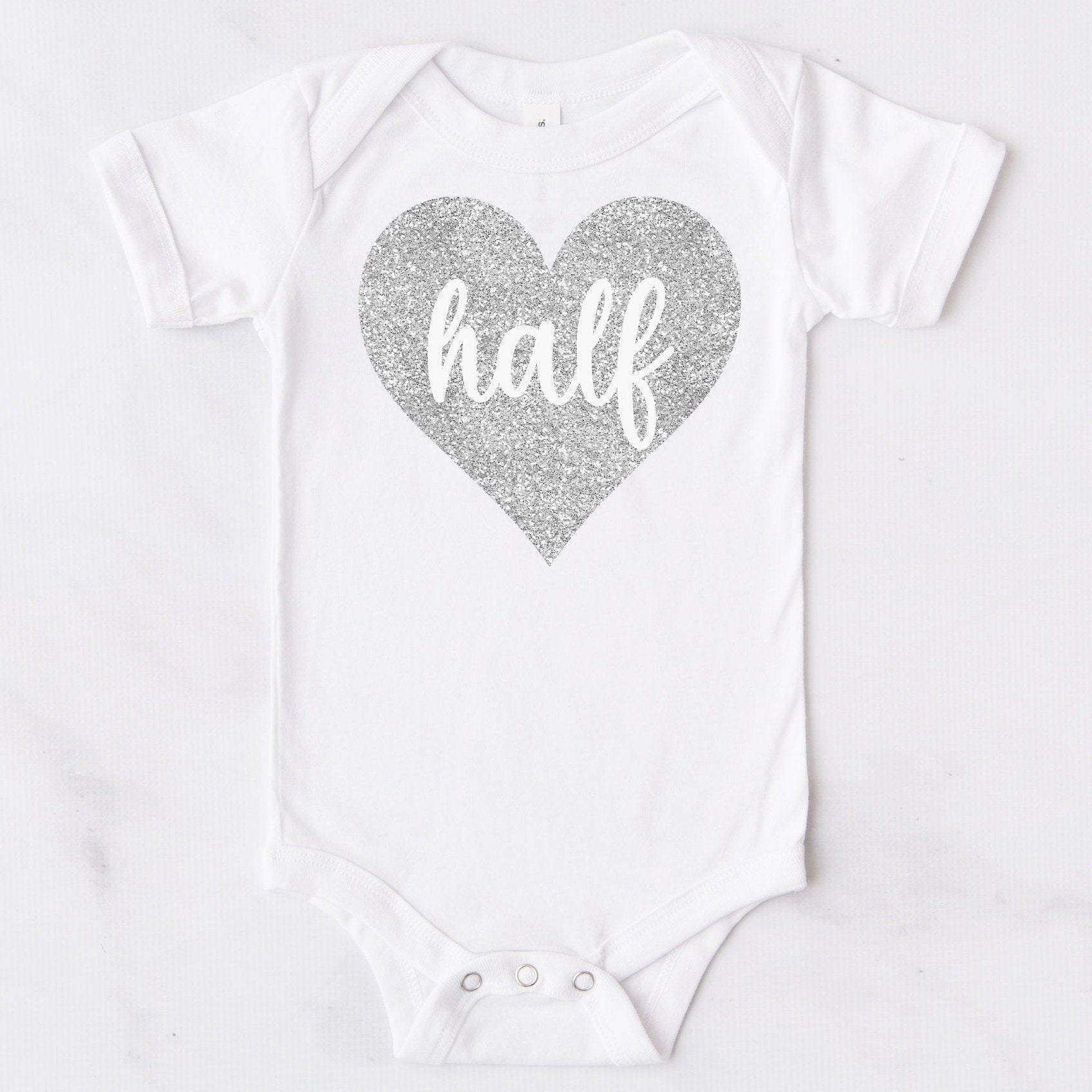 This gorgeous half birthday bodysuit features a 'half' print in a super sparkly silver glitter heart. It is made from soft cotton and is super comfortable for your little girl to wear all day long - practical & adorable! Perfect for celebrating your baby girls 6 month milestone!